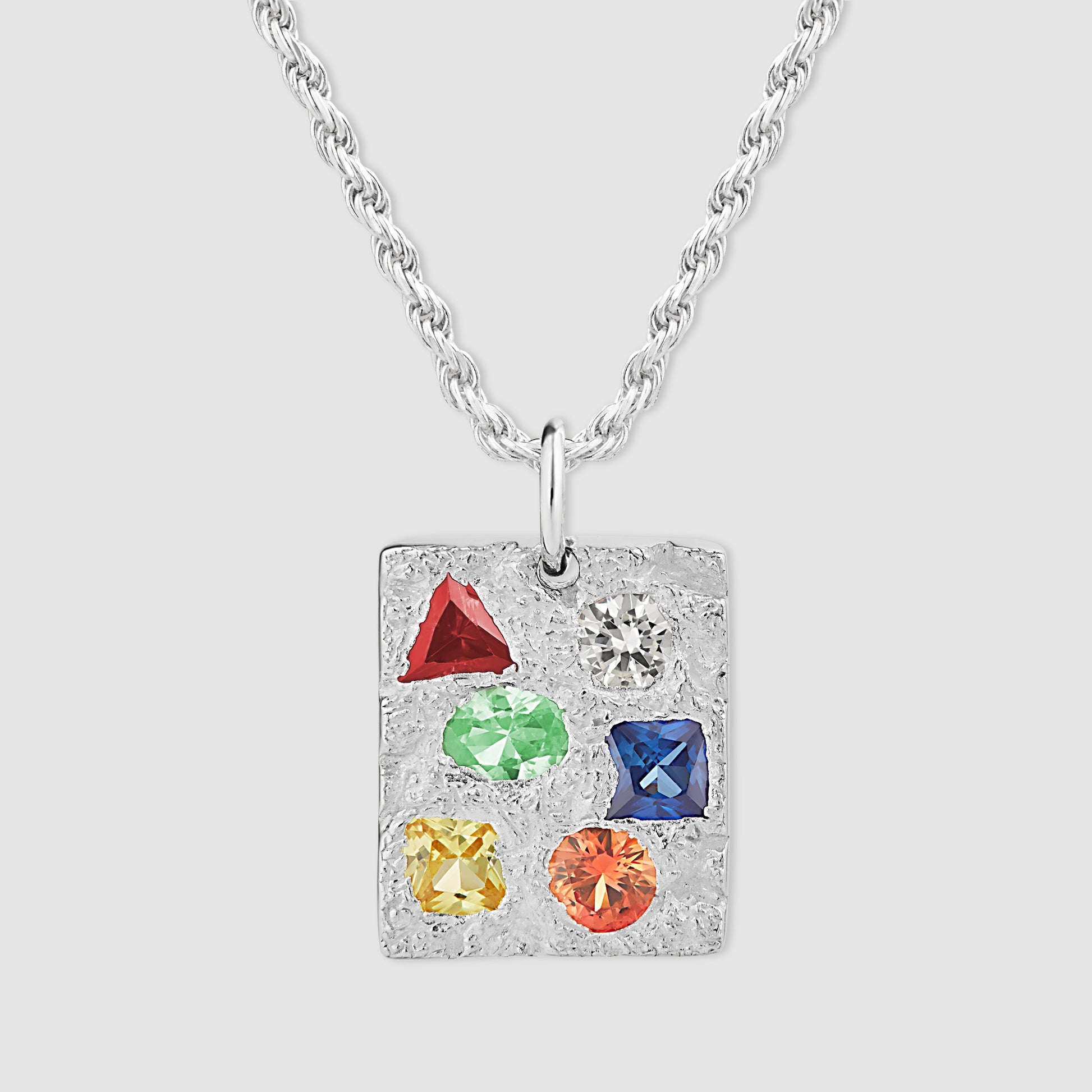 A rectangular pendant with a variation of different cut sapphires, in a variety of colours.