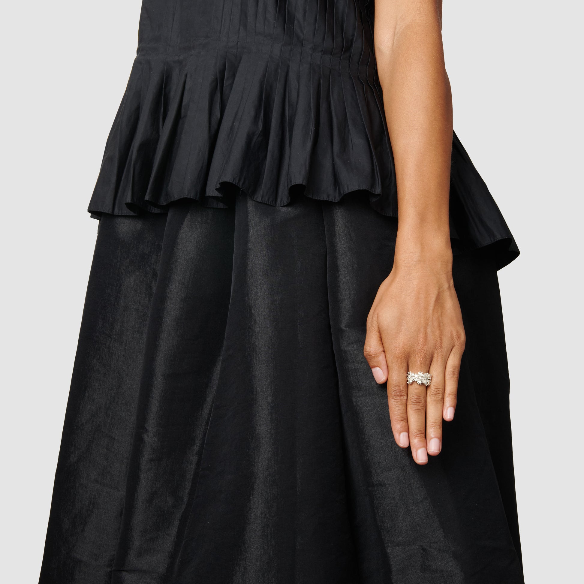 This ring is an impression of the Wildflower Ring which is a Bleue Burnham classic silhouette. The original ring features various sized round-cut gemstones set at various heights. This is an exact replica of that, with solid sterling silver replacing the formation of the gemstones. The ring head measures 12x23mm.